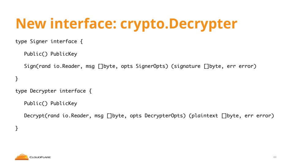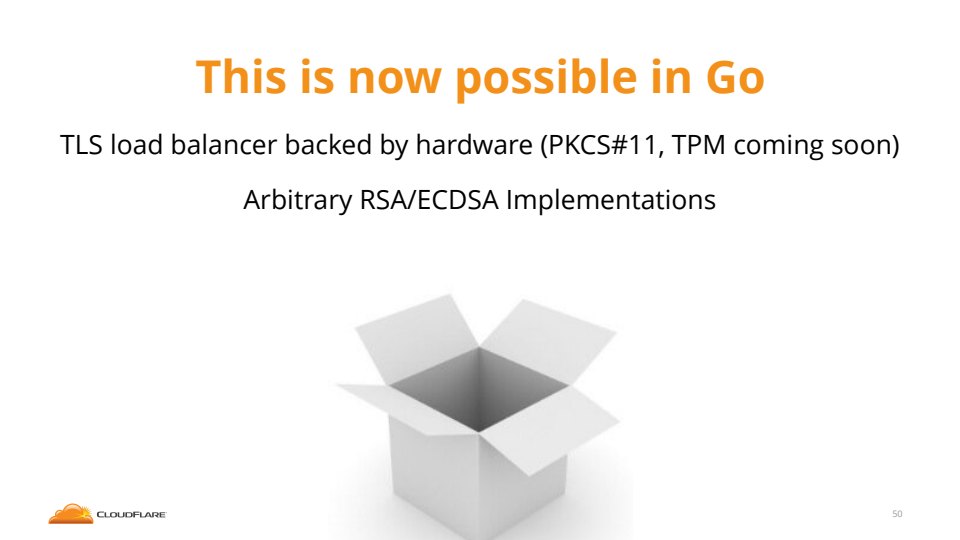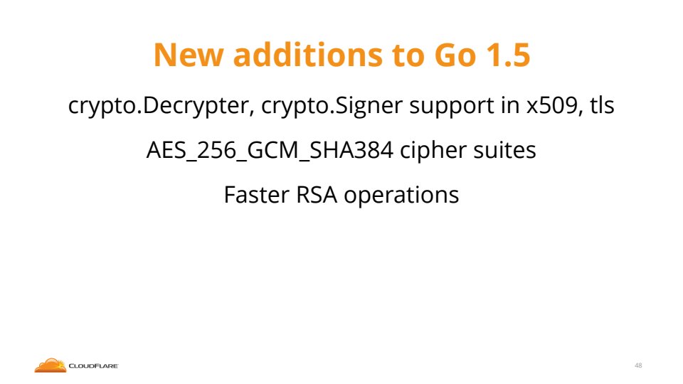 If you don’t know, now you know… Go has an amazing cryptography package built into the standard library. In Go 1.5 it’s better than ever. Join CloudFlare’s Nick Sullivan for a presentation that explores the new interfaces crypto.Signer and crypto.Decrypter. Learn how they can be used to enable some powerful new features. Nick will also cover how his team improved the speed of crypto operations by up to 20x using Go’s inline assembly feature. Attendees will also uncover how to enable cool features like serving a website over HTTPS while storing the private key inside of hardware like a Trusted Platform Module (TPM) or a Hardware Security Module (HSM)!