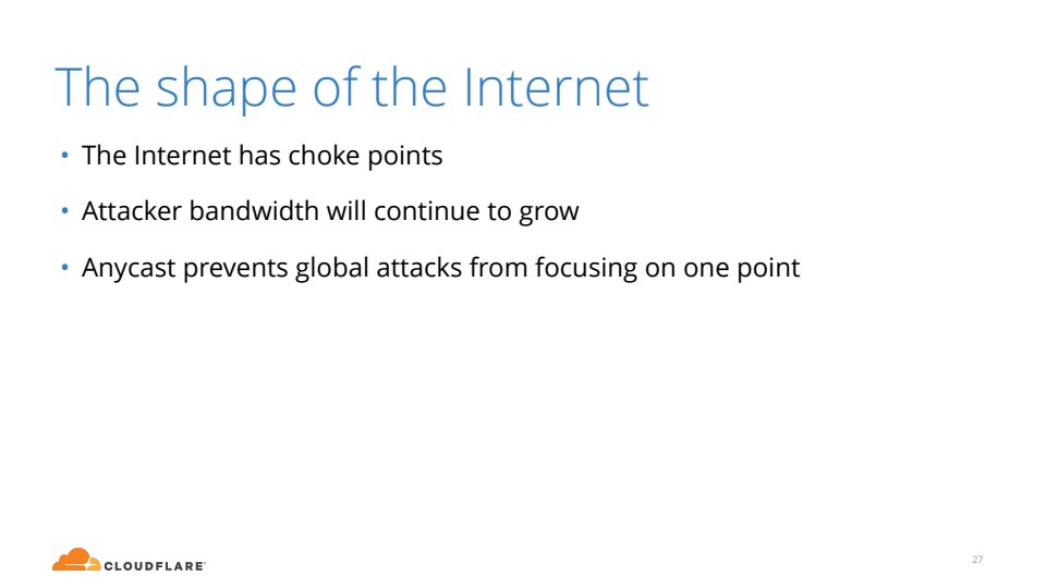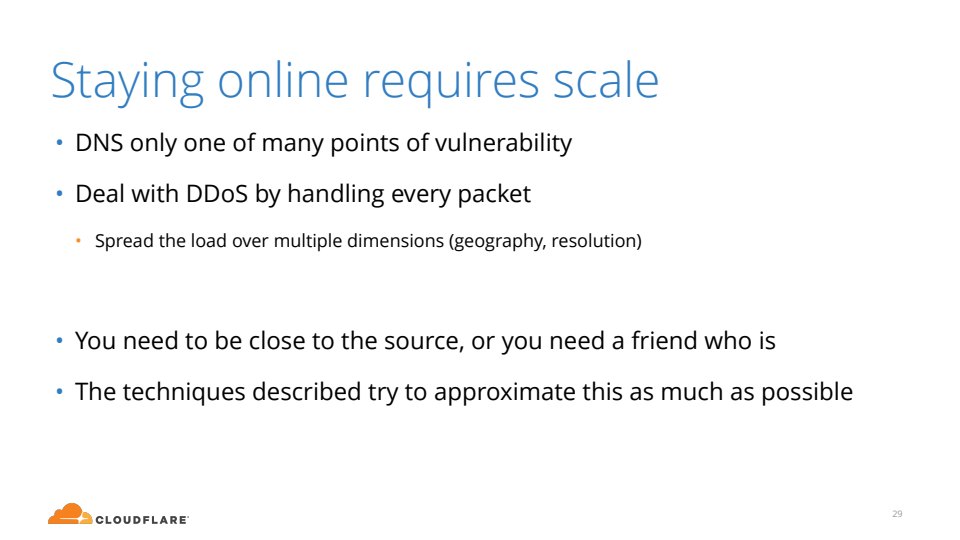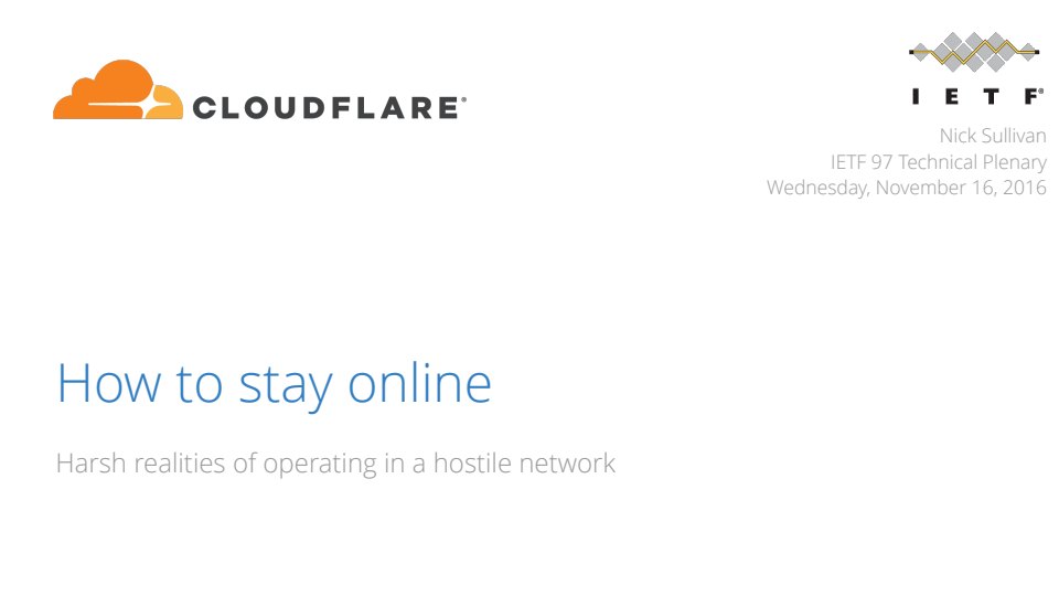 I presented this talk at the IETF 97 technical plenary weeks after the devastating DDoS on Dyn that took down significant portion of the Internet in late 2016. In it I describe techniques that can be used to stay online in as the Internet gets increasingly dangerous. Most of the data and content came from my colleague Marek Majkowski.