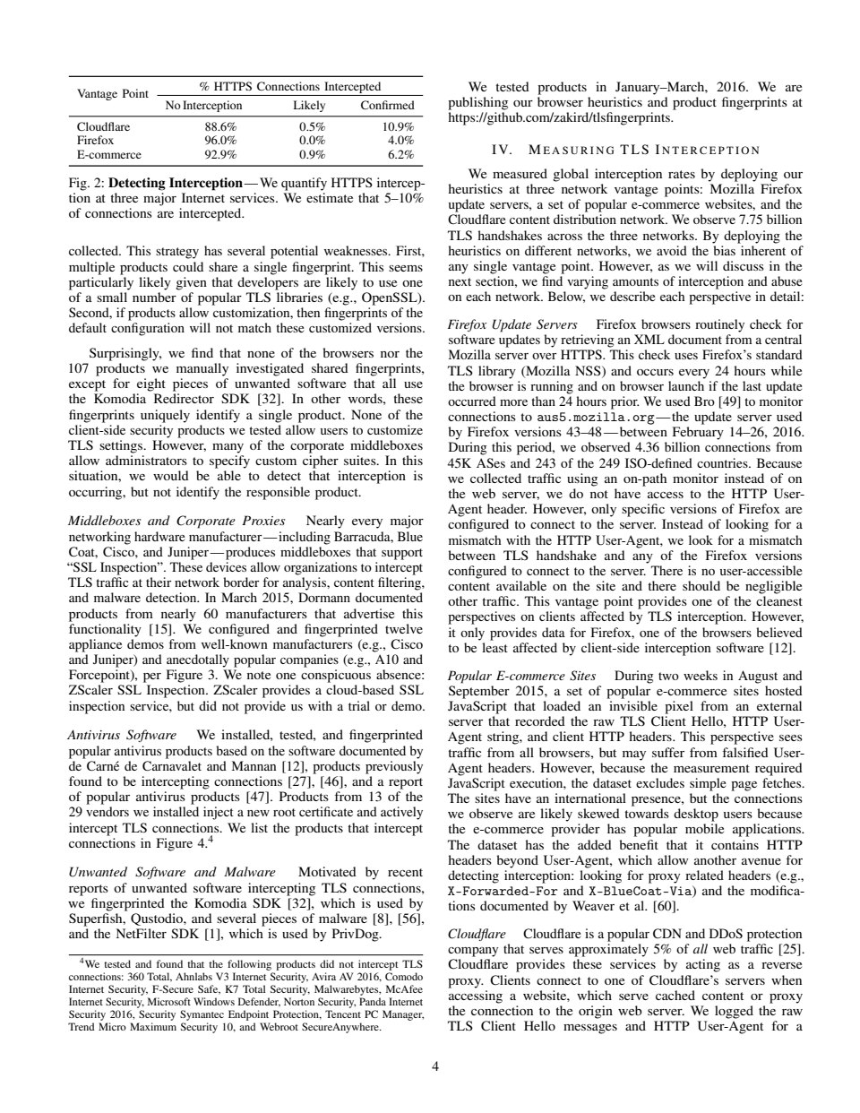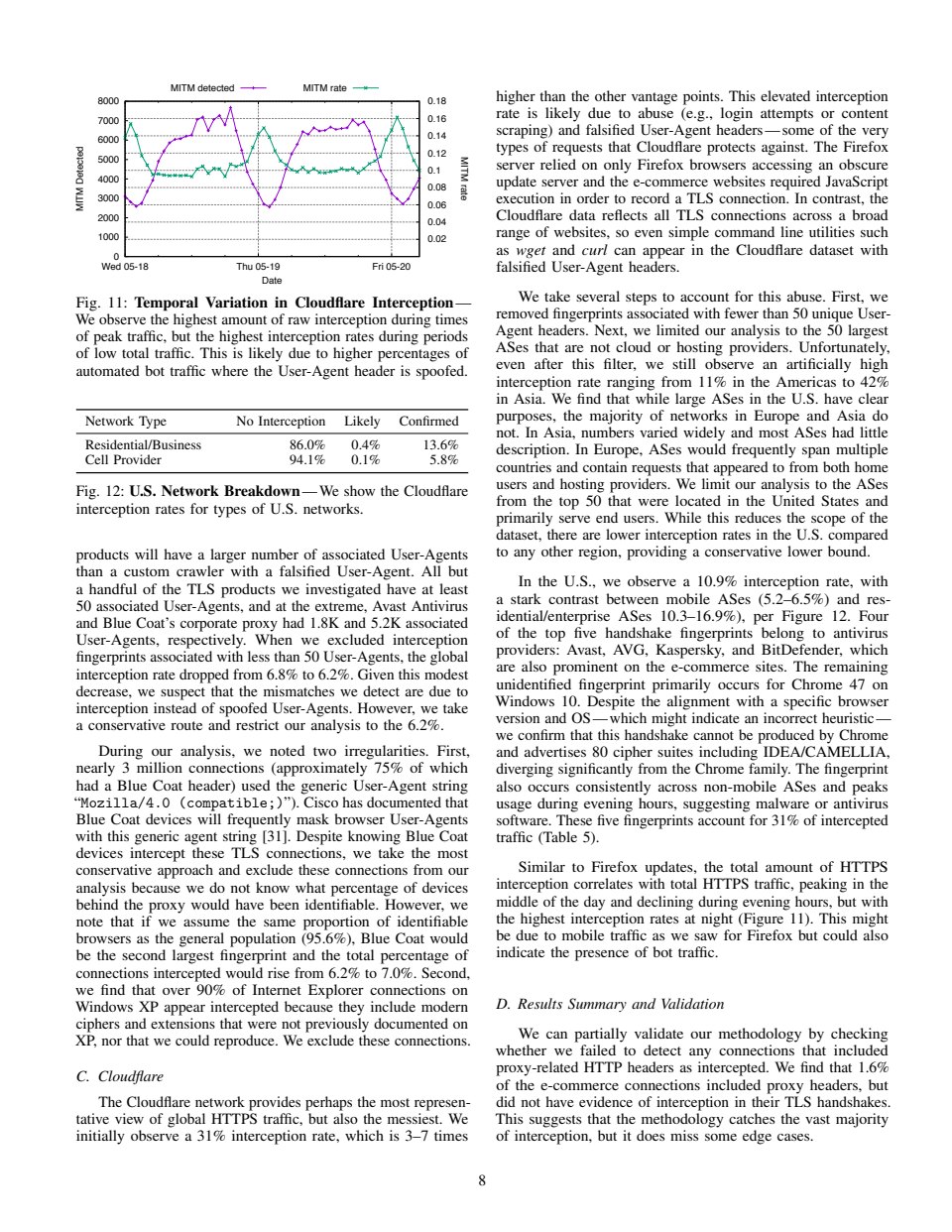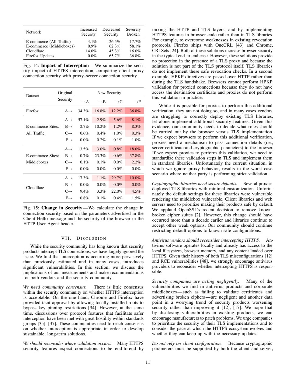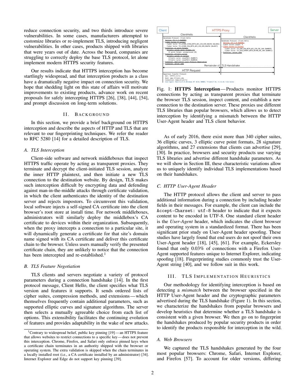 As HTTPS deployment grows, middlebox and an- tivirus products are increasingly intercepting TLS connections to retain visibility into network traffic. In this work, we present a comprehensive study on the prevalence and impact of HTTPS in- terception. First, we show that web servers can detect interception by identifying a mismatch between the HTTP User-Agent header and TLS client behavior. We characterize the TLS handshakes of major browsers and popular interception products, which we use to build a set of heuristics to detect interception and identify the responsible product. We deploy these heuristics at three large network providers: (1) Mozilla Firefox update servers, (2) a set of popular e-commerce sites, and (3) the Cloudflare content distribution network. We find more than an order of magnitude more interception than previously estimated and with dramatic impact on connection security. To understand why security suffers, we investigate popular middleboxes and client- side security software, finding that nearly all reduce connection security and many introduce severe vulnerabilities. Drawing on our measurements, we conclude with a discussion on recent proposals to safely monitor HTTPS and recommendations for the security community.