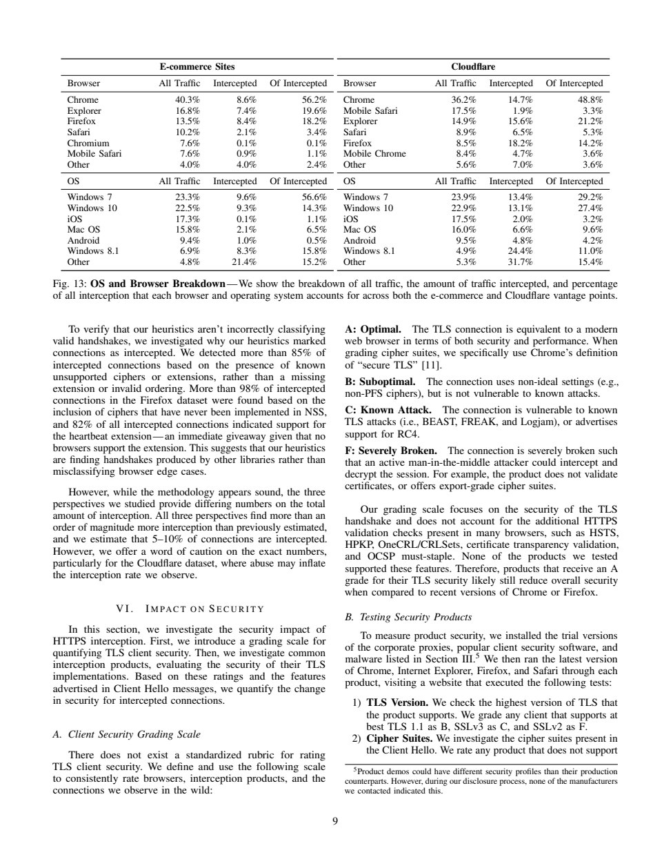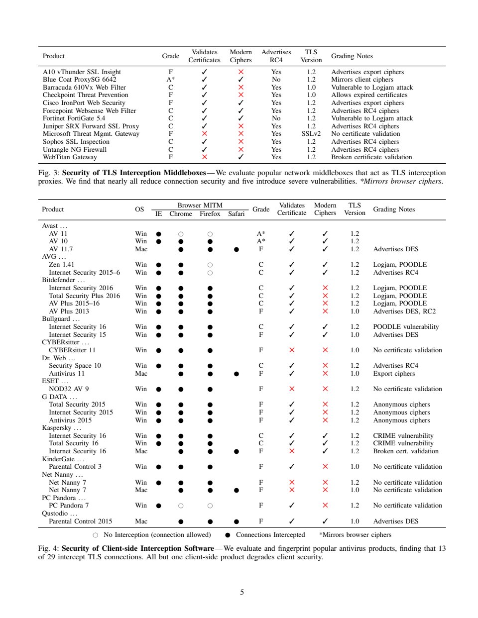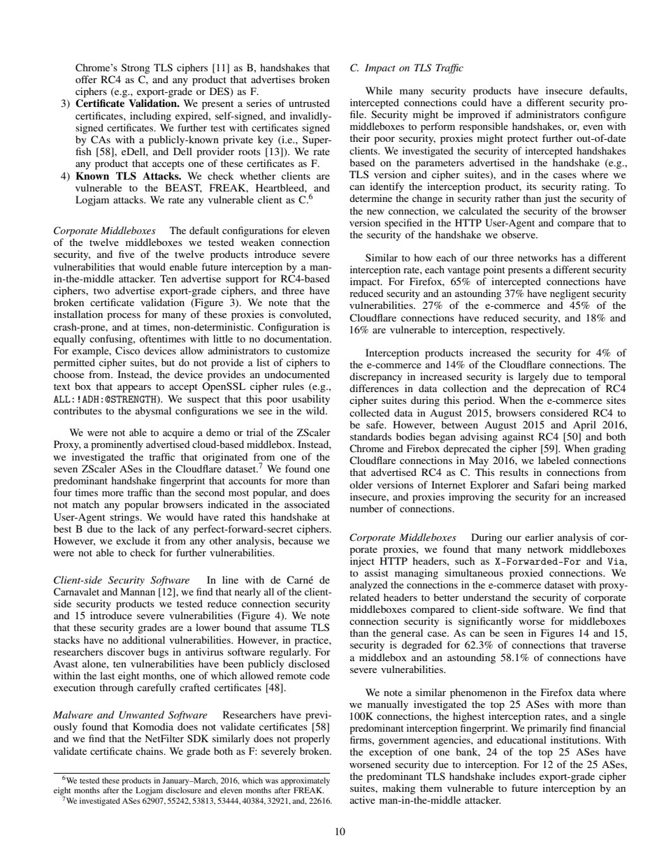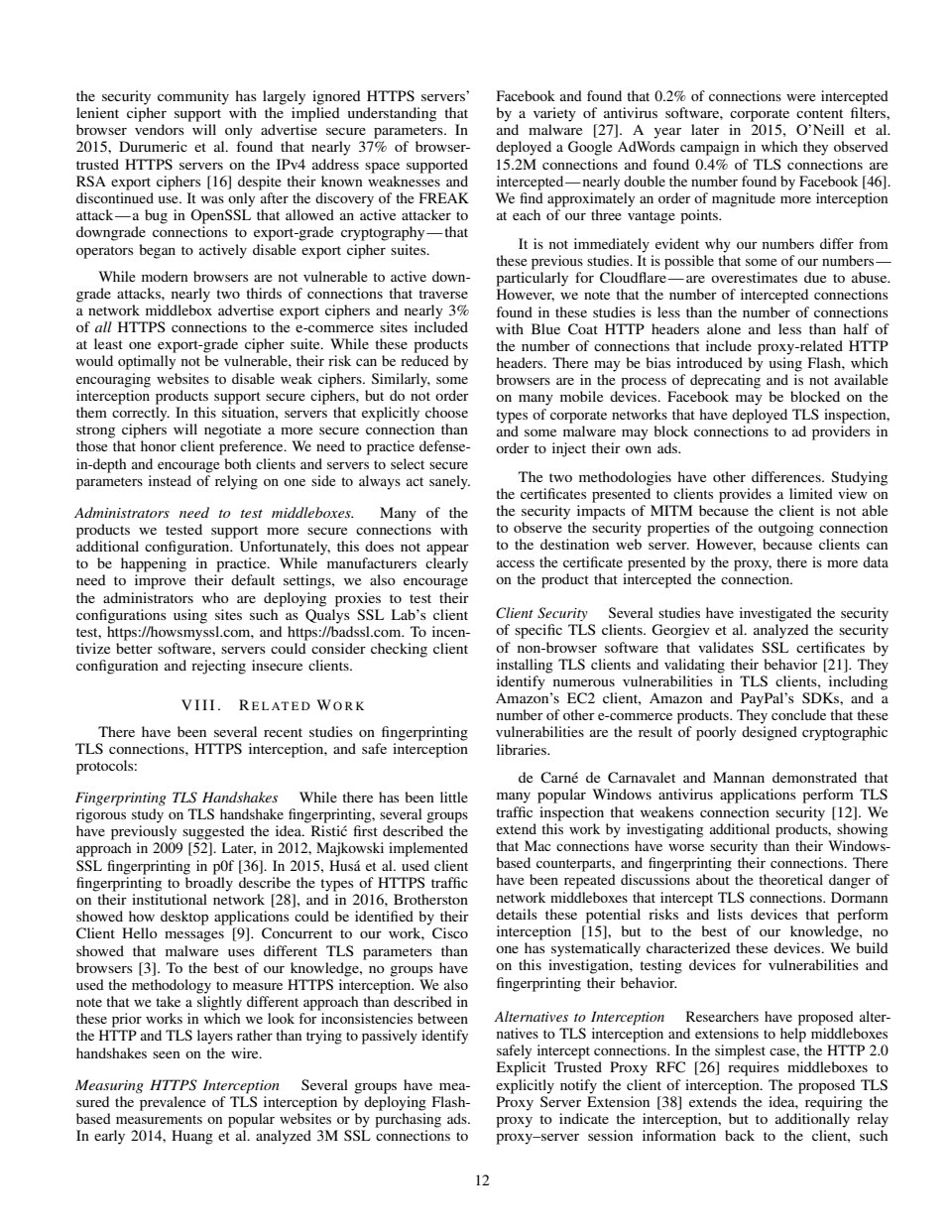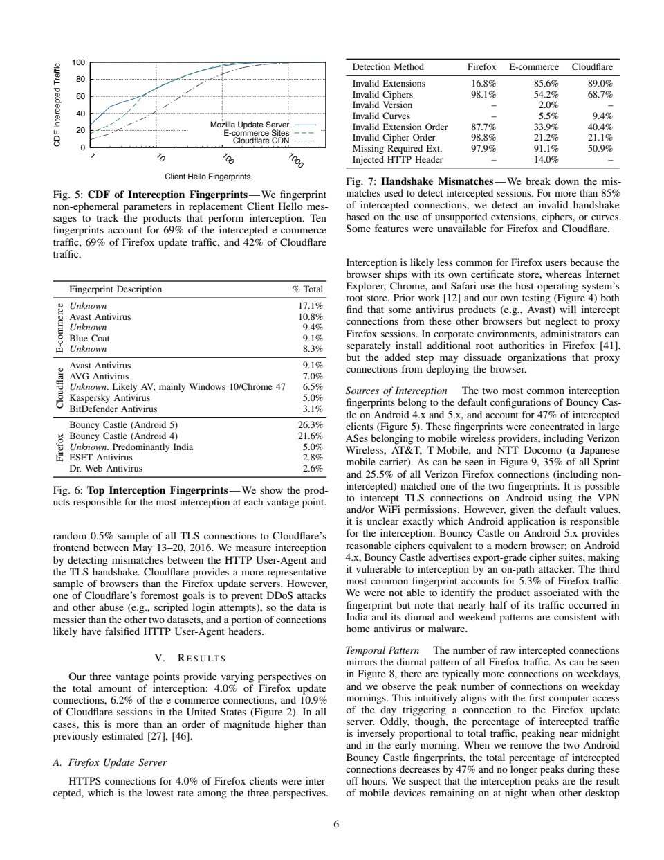 As HTTPS deployment grows, middlebox and an- tivirus products are increasingly intercepting TLS connections to retain visibility into network traffic. In this work, we present a comprehensive study on the prevalence and impact of HTTPS in- terception. First, we show that web servers can detect interception by identifying a mismatch between the HTTP User-Agent header and TLS client behavior. We characterize the TLS handshakes of major browsers and popular interception products, which we use to build a set of heuristics to detect interception and identify the responsible product. We deploy these heuristics at three large network providers: (1) Mozilla Firefox update servers, (2) a set of popular e-commerce sites, and (3) the Cloudflare content distribution network. We find more than an order of magnitude more interception than previously estimated and with dramatic impact on connection security. To understand why security suffers, we investigate popular middleboxes and client- side security software, finding that nearly all reduce connection security and many introduce severe vulnerabilities. Drawing on our measurements, we conclude with a discussion on recent proposals to safely monitor HTTPS and recommendations for the security community.