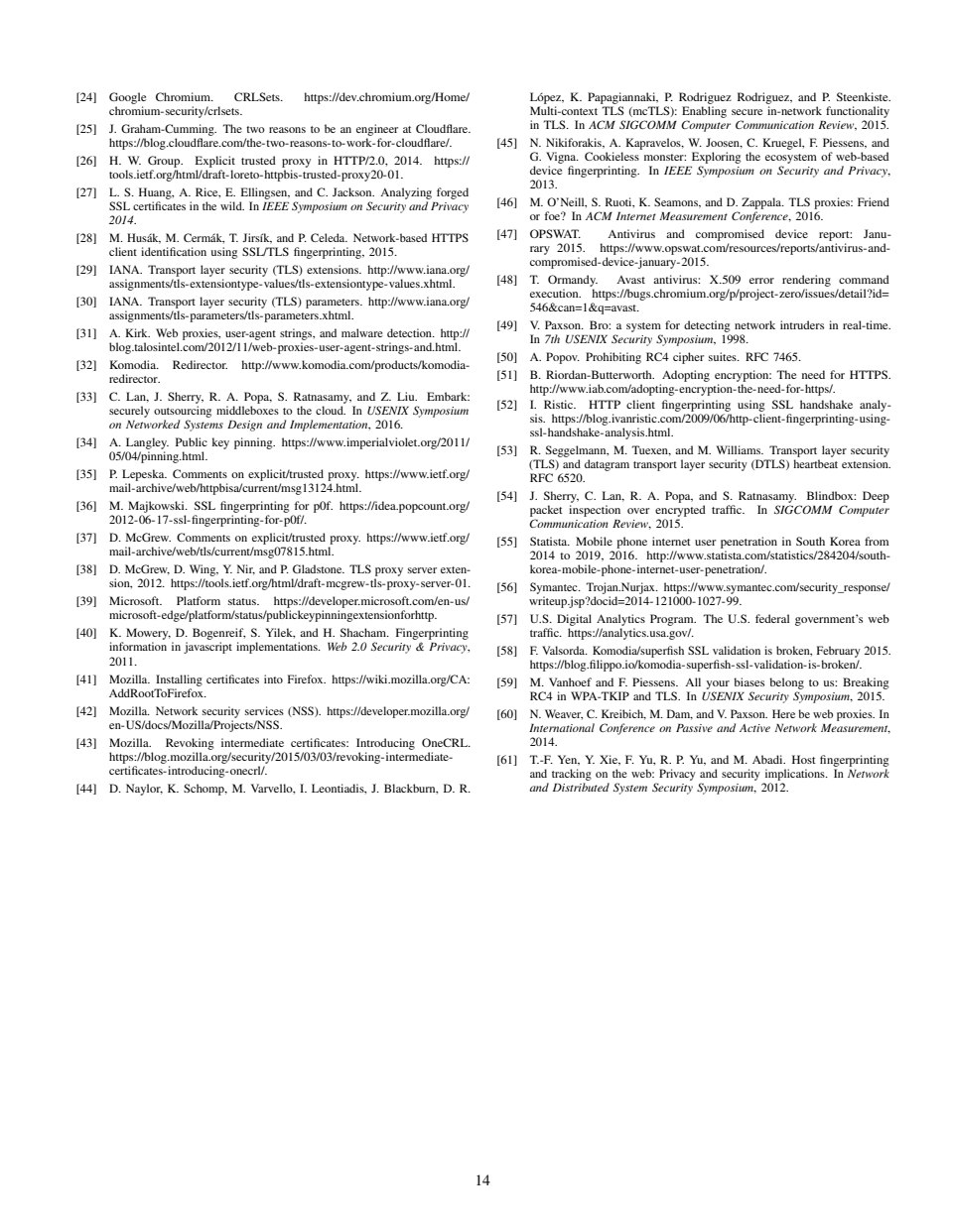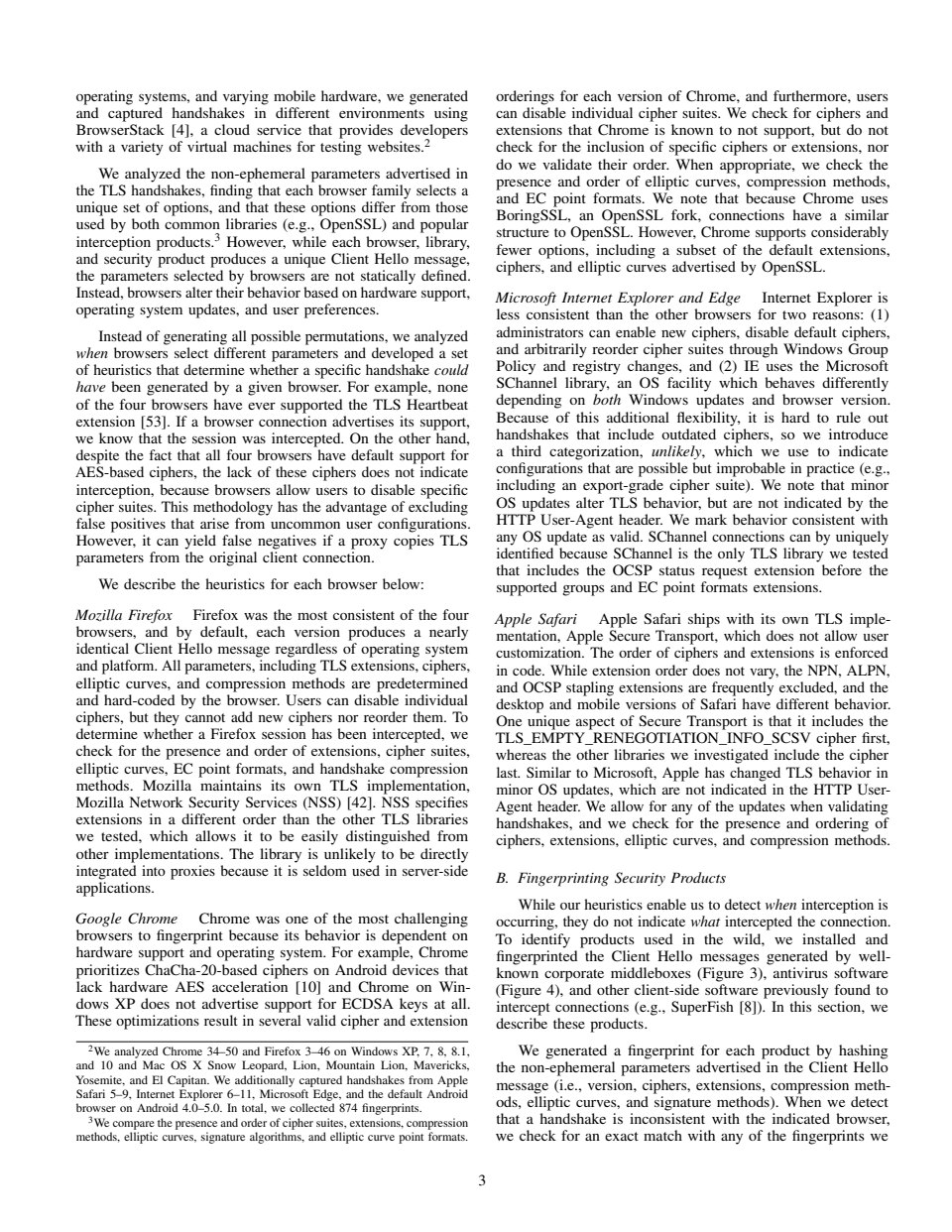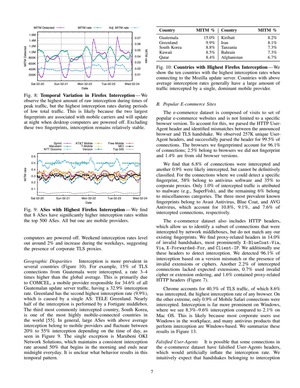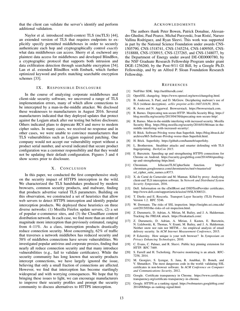 As HTTPS deployment grows, middlebox and an- tivirus products are increasingly intercepting TLS connections to retain visibility into network traffic. In this work, we present a comprehensive study on the prevalence and impact of HTTPS in- terception. First, we show that web servers can detect interception by identifying a mismatch between the HTTP User-Agent header and TLS client behavior. We characterize the TLS handshakes of major browsers and popular interception products, which we use to build a set of heuristics to detect interception and identify the responsible product. We deploy these heuristics at three large network providers: (1) Mozilla Firefox update servers, (2) a set of popular e-commerce sites, and (3) the Cloudflare content distribution network. We find more than an order of magnitude more interception than previously estimated and with dramatic impact on connection security. To understand why security suffers, we investigate popular middleboxes and client- side security software, finding that nearly all reduce connection security and many introduce severe vulnerabilities. Drawing on our measurements, we conclude with a discussion on recent proposals to safely monitor HTTPS and recommendations for the security community.
