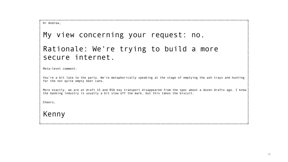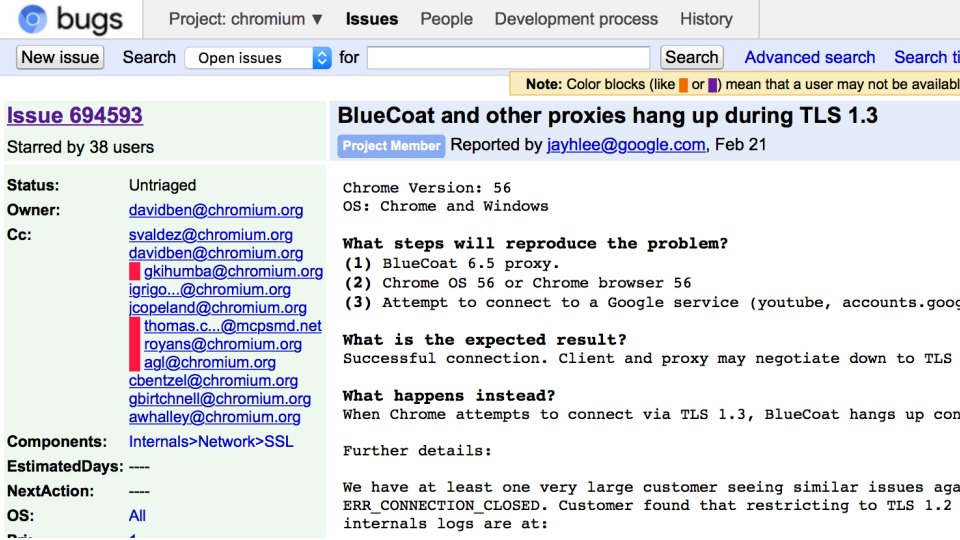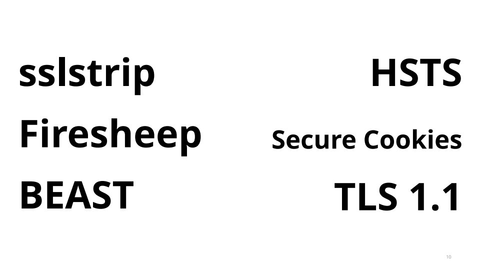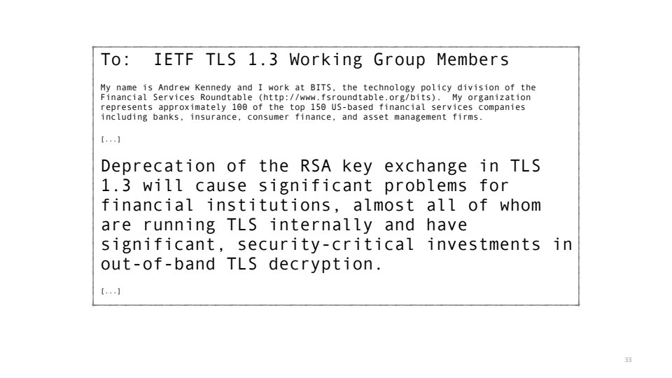 There is a very strong tension in the security industry right now between the proponents of end-to-end encryption and those who use network inspection as a core tool to understand threats and information flows. This debate is particularly relevant to the web, where HTTPS adoption passed 50 percent this year and tensions continues to rise. New research shows that both intercepting proxies and anti-virus software are reducing the security of encrypted connections significantly. In this talk, I explore the various angles of this debate within a historical context.