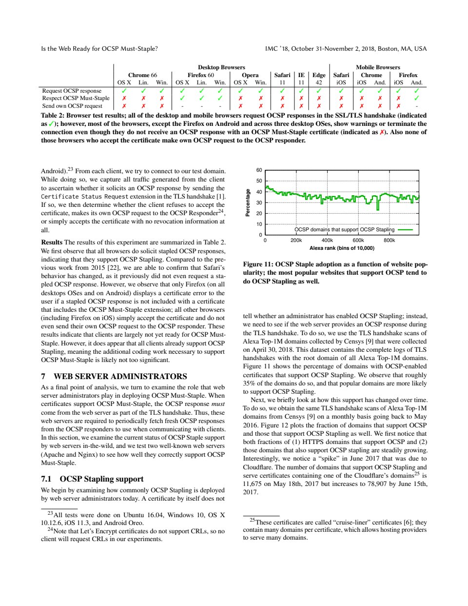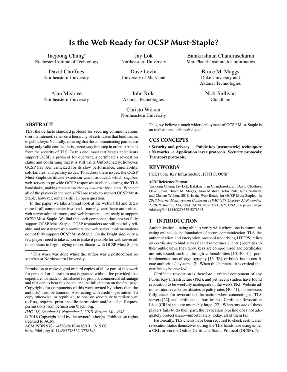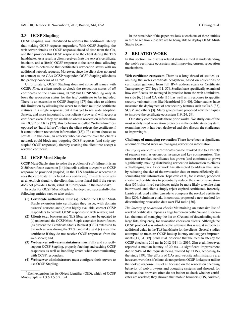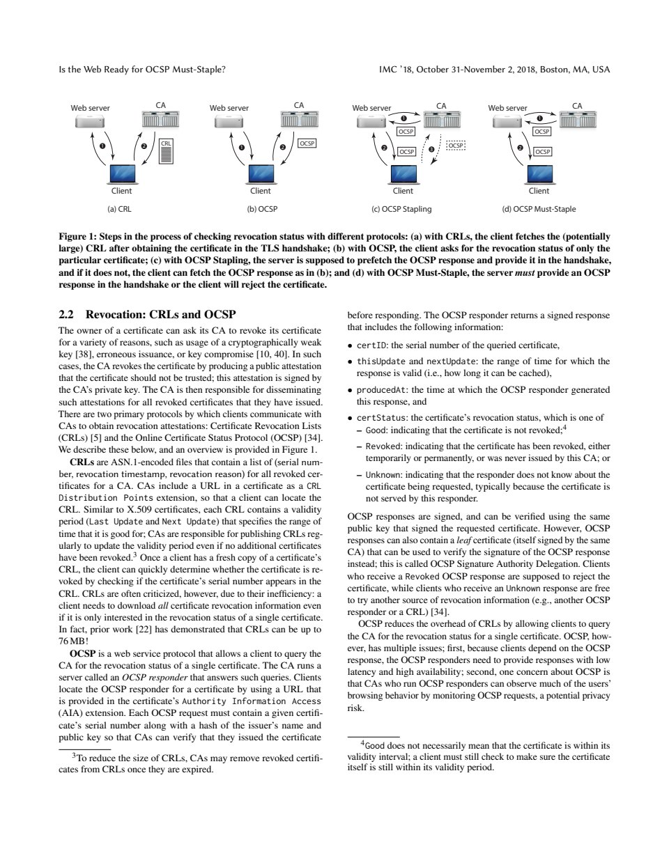 TLS, the de facto standard protocol for securing communications over the Internet, relies on a hierarchy of certificates that bind names to public keys. Naturally, ensuring that the communicating parties are using only valid certificates is a necessary first step in order to benefit from the security of TLS. To this end, most certificates and clients support OCSP, a protocol for querying a certificate’s revocation status and confirming that it is still valid. Unfortunately, however, OCSP has been criticized for its slow performance, unreliability, soft-failures, and privacy issues. To address these issues, the OCSP Must-Staple certificate extension was introduced, which requires web servers to provide OCSP responses to clients during the TLS handshake, making revocation checks low-cost for clients. Whether all of the players in the web’s PKI are ready to support OCSP Must- Staple, however, remains still an open question.