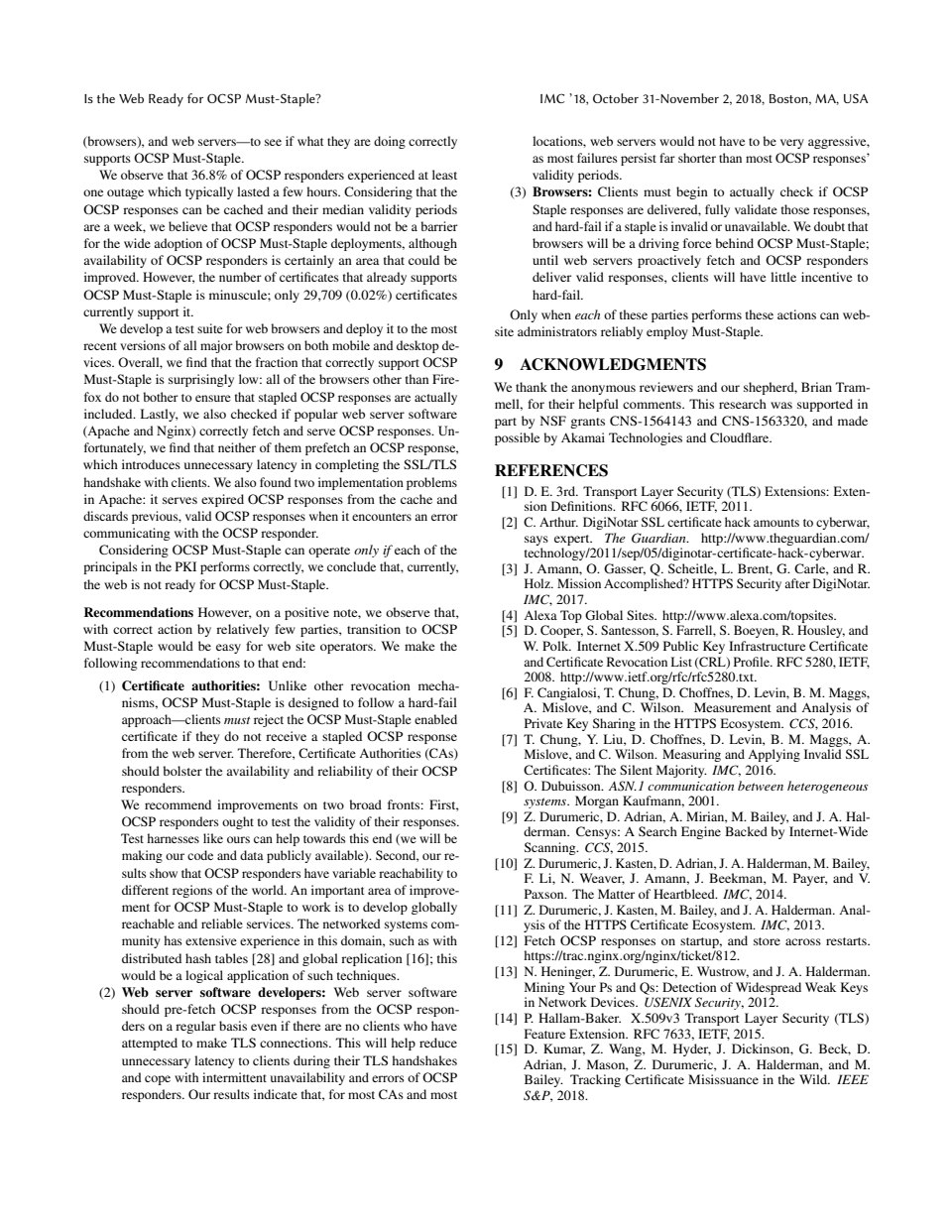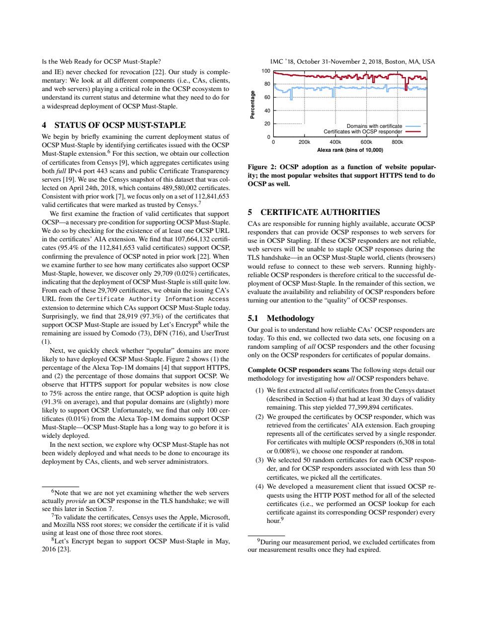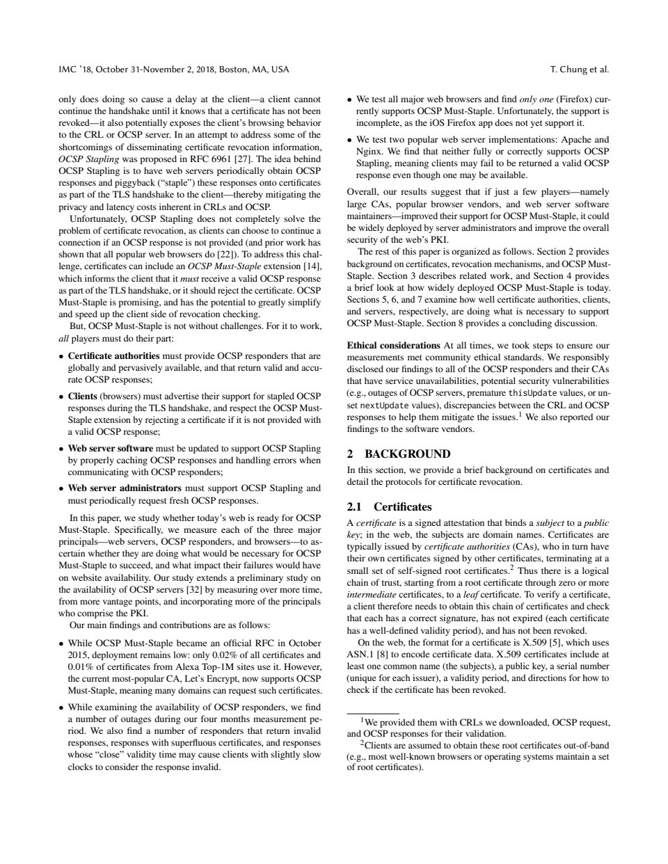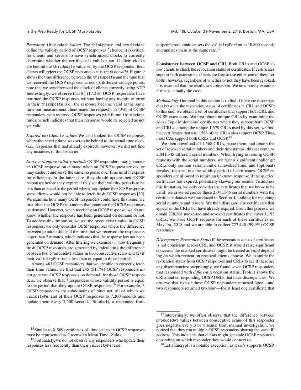 TLS, the de facto standard protocol for securing communications over the Internet, relies on a hierarchy of certificates that bind names to public keys. Naturally, ensuring that the communicating parties are using only valid certificates is a necessary first step in order to benefit from the security of TLS. To this end, most certificates and clients support OCSP, a protocol for querying a certificate’s revocation status and confirming that it is still valid. Unfortunately, however, OCSP has been criticized for its slow performance, unreliability, soft-failures, and privacy issues. To address these issues, the OCSP Must-Staple certificate extension was introduced, which requires web servers to provide OCSP responses to clients during the TLS handshake, making revocation checks low-cost for clients. Whether all of the players in the web’s PKI are ready to support OCSP Must- Staple, however, remains still an open question.