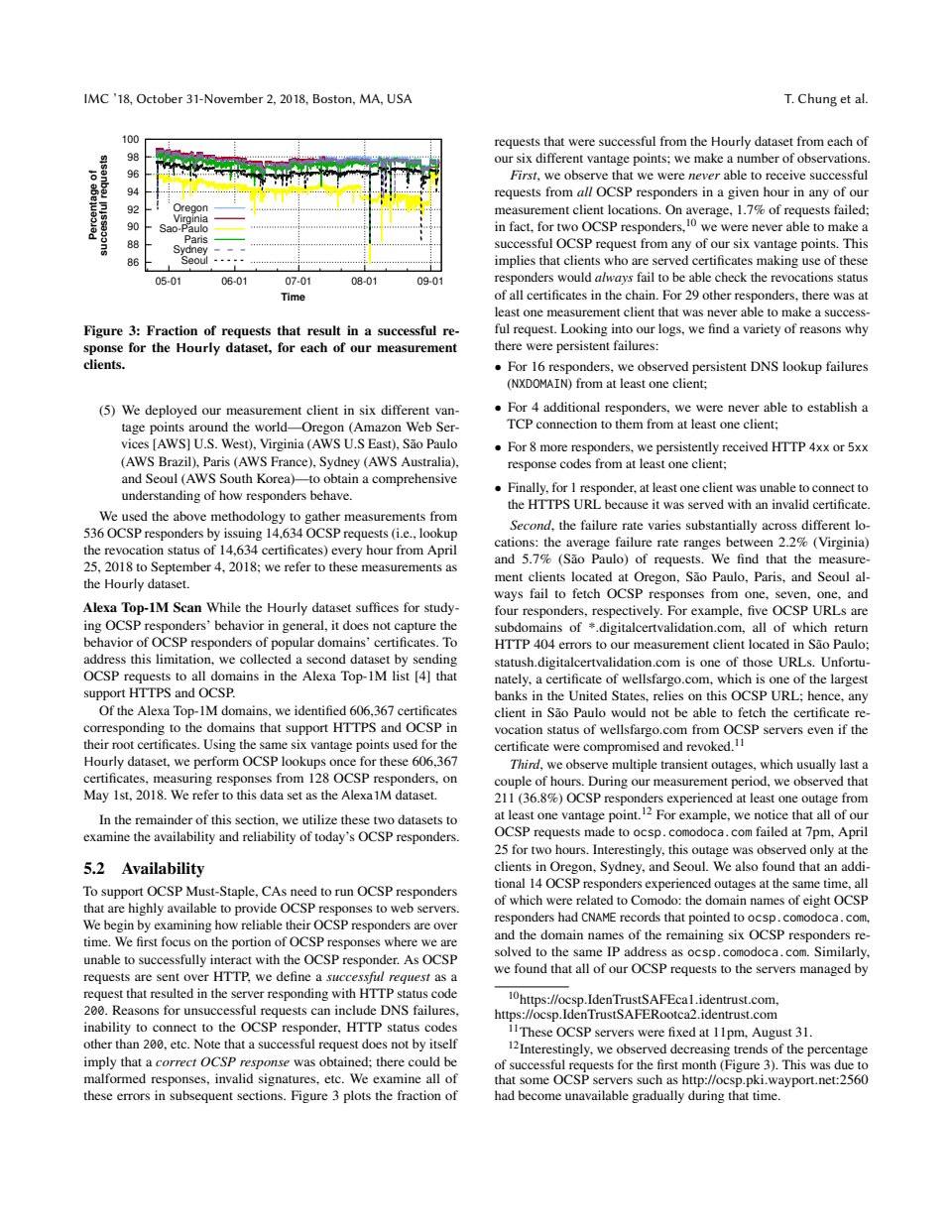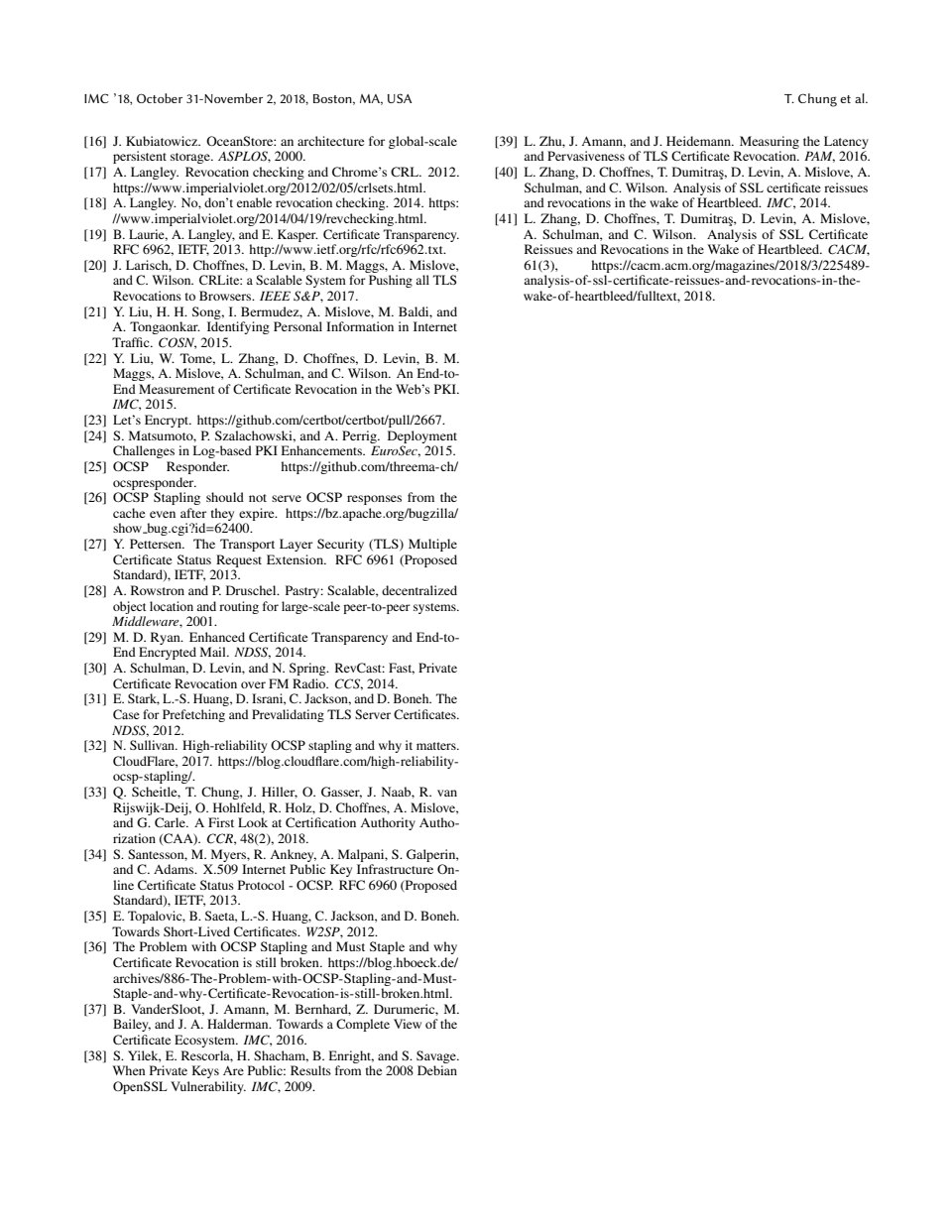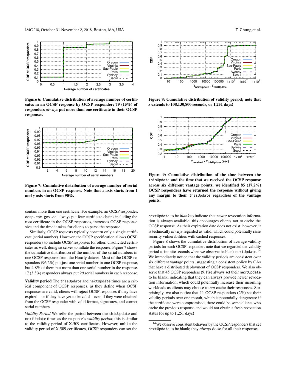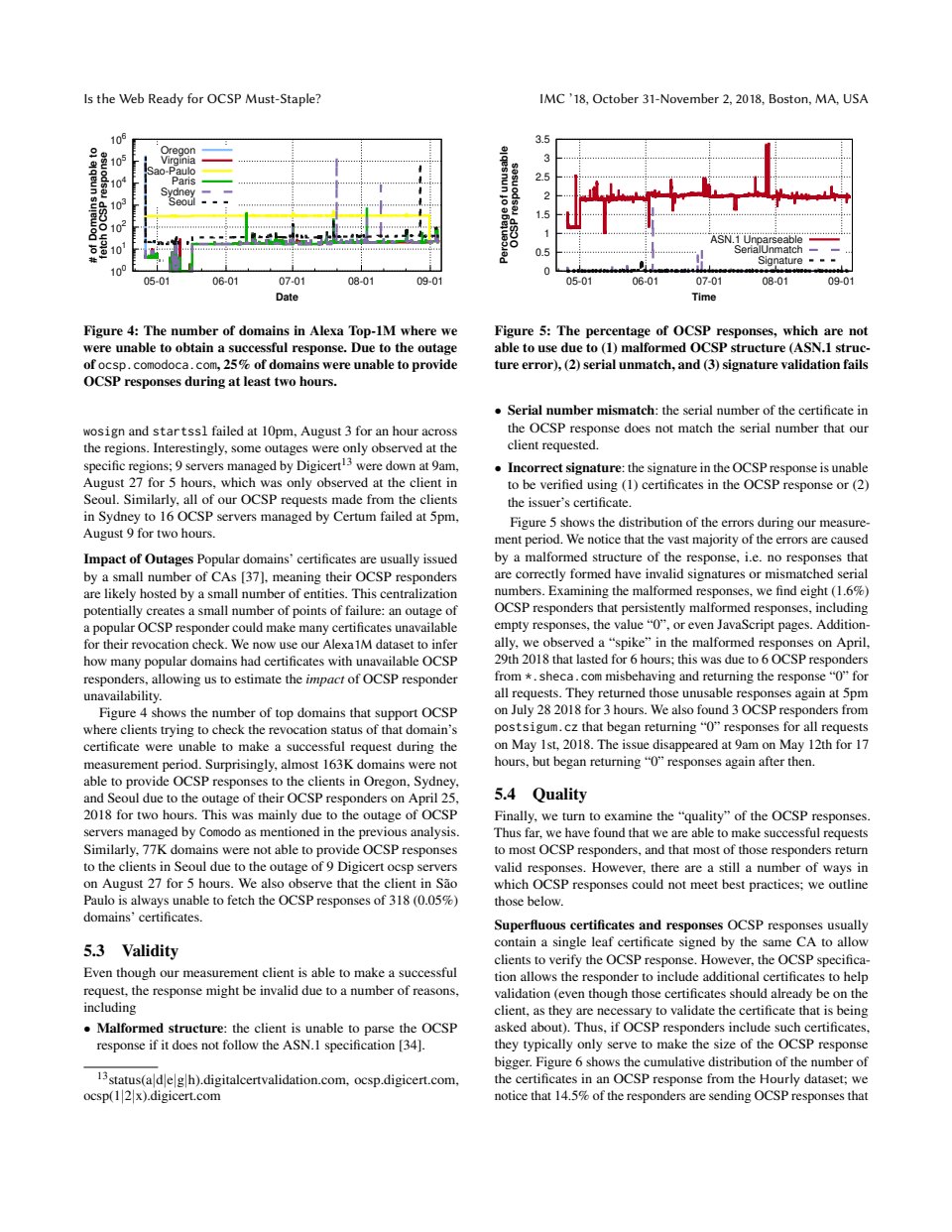 TLS, the de facto standard protocol for securing communications over the Internet, relies on a hierarchy of certificates that bind names to public keys. Naturally, ensuring that the communicating parties are using only valid certificates is a necessary first step in order to benefit from the security of TLS. To this end, most certificates and clients support OCSP, a protocol for querying a certificate’s revocation status and confirming that it is still valid. Unfortunately, however, OCSP has been criticized for its slow performance, unreliability, soft-failures, and privacy issues. To address these issues, the OCSP Must-Staple certificate extension was introduced, which requires web servers to provide OCSP responses to clients during the TLS handshake, making revocation checks low-cost for clients. Whether all of the players in the web’s PKI are ready to support OCSP Must- Staple, however, remains still an open question.
